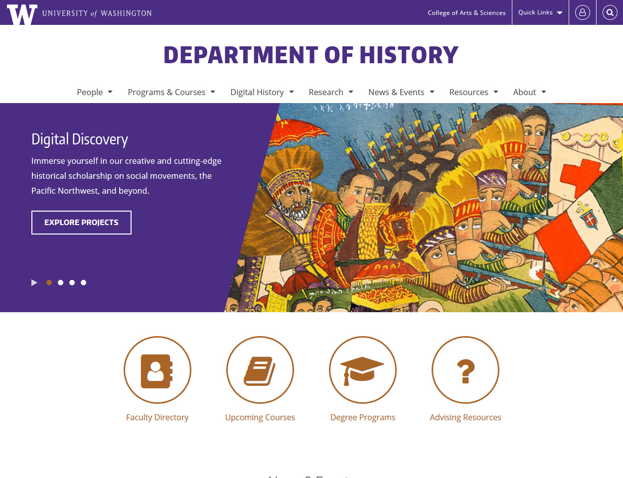 The 30th site to launch in our series of Department Web Framework sites at the University of Washington College of Arts and Sciences. I faciliated the visual design process, creating mockups and guiding the client through selecting images and messaging for the front page. I also provided guidance to the lead developer throughout the project, advised on navigation and information architecture, and ensured standards of quality were met.