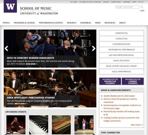 Our largest Department Web Framework site so far, with over 80 faculty and staff, 54 degree programs, and hundreds of events. Customized the Framework to create rich landing pages for the Areas of Study and Ensembles, unique features of the School of Music.